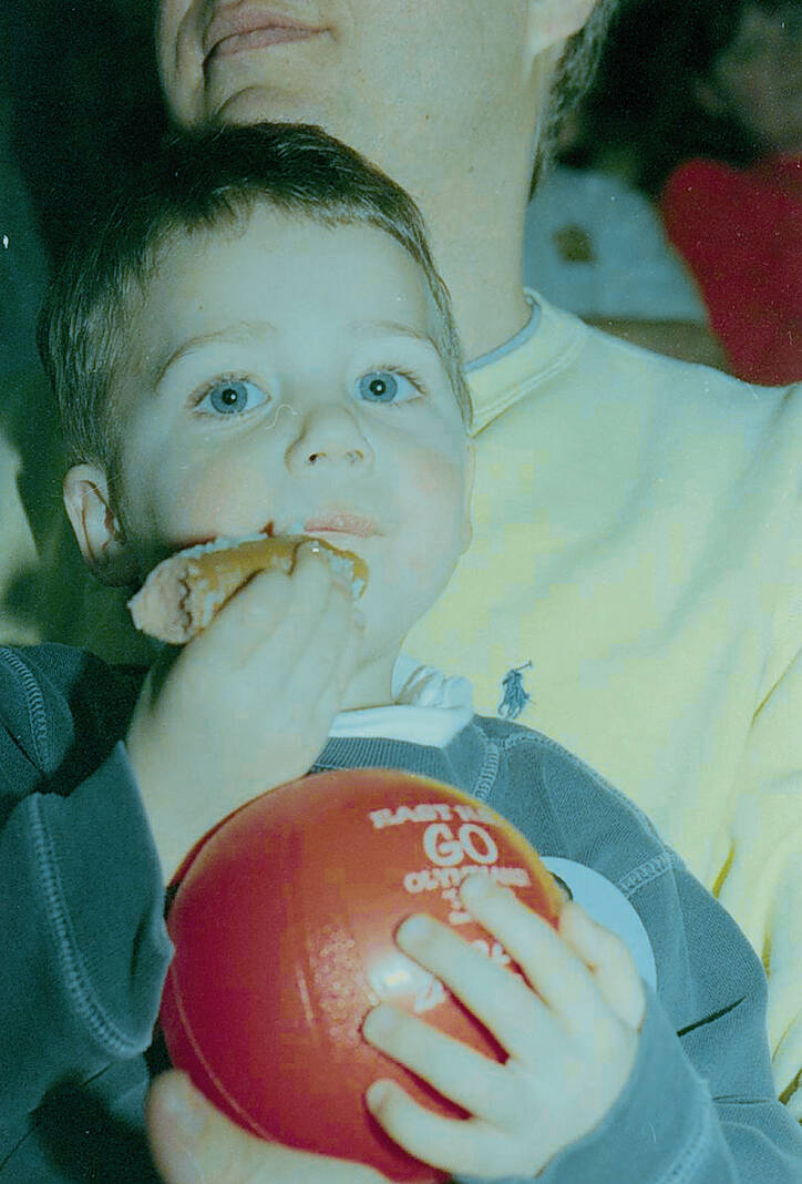 Tye Thixton, 2, enjoys a hotdog before the start of Columbus East High School’s home game with Hauser on Jan. 13, 2000.