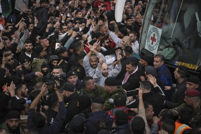 RAMALLAH, West Bank — Thousands of Palestinians in the West Bank city of Ramallah celebrated the arrival of buses carrying dozens of prisoners released as part of the Israel-Hamas ceasefire.