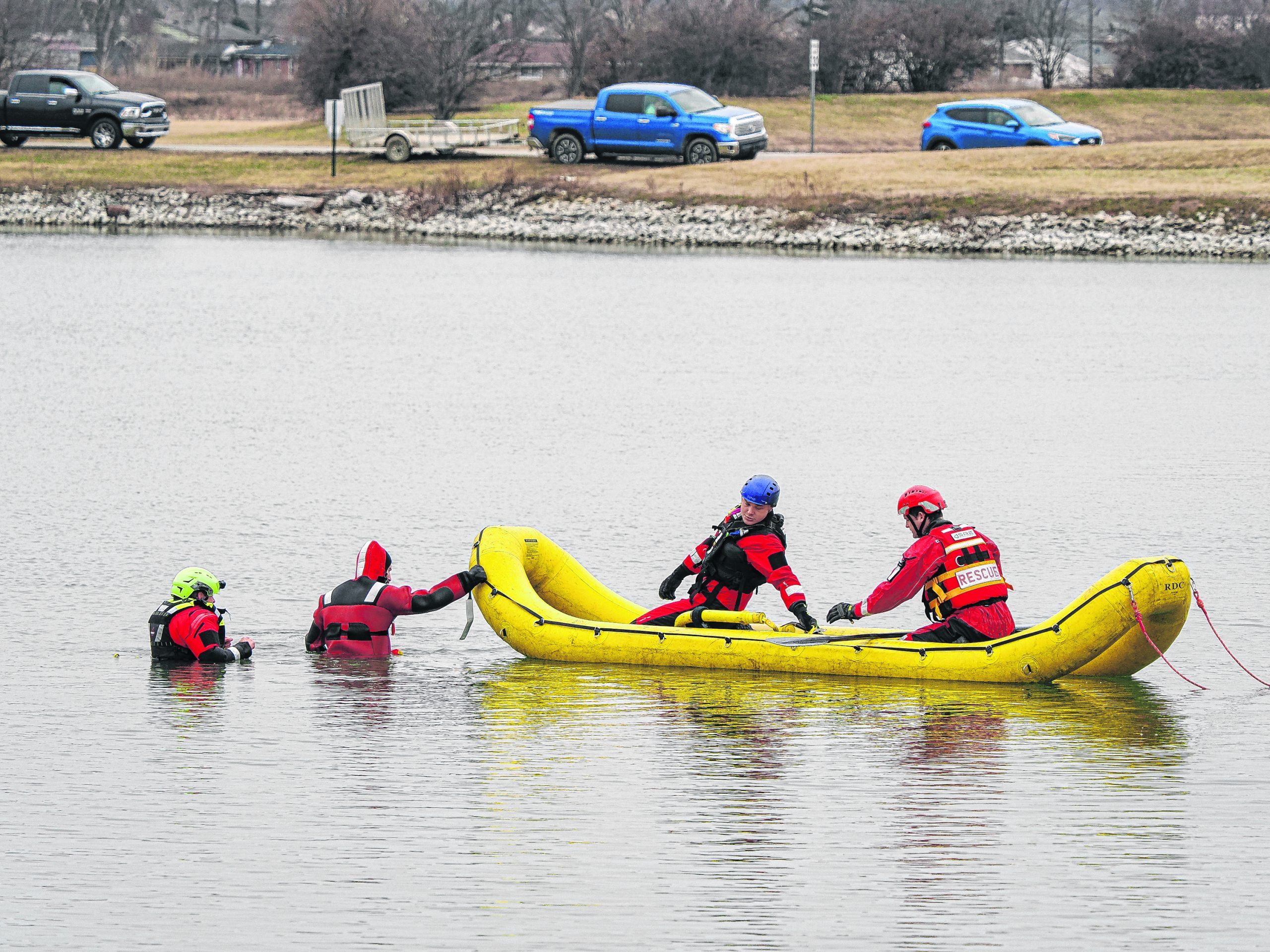 Mike Wolanin | The Republic First responders conduct a water rescue at a retention pond at the intersection of Kenholt Drive and Indianapolis Road near Applied Laboratories, Inc., in Columbus, Ind., Tuesday, Feb. 11, 2025. The driver was extricated from the vehicle.