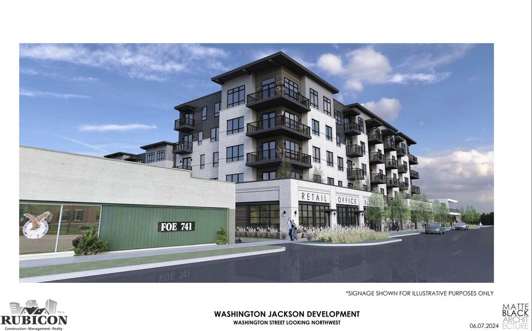 Photo provided An artist’s rendition of the Rubicon project, a planned five-story, 120-unit apartment building that would cause the demolition of a drive-thru bank at 921 Jackson St. and house with historical ties at 1008 Washington St.