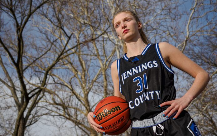 Jennings County junior Mollie Ernstes is The Republic Girls Basketball Player of the Year. She is pictured at Lincoln Park in Columbus, Ind., Monday, Feb. 24, 2025. Mike Wolanin | The Republic