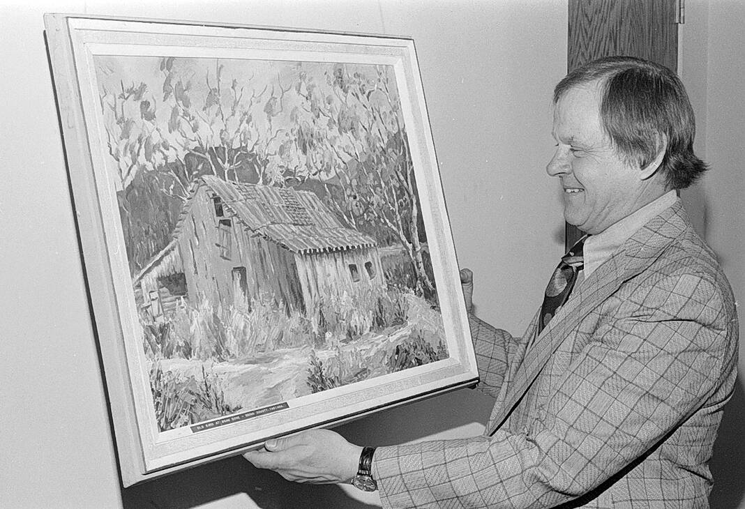 Robert Muckler, executive secretary of the Columbus Area Chamber of Commerce, looks with approval at a painting of “The Gnaw Bone Barn” on April 15, 1975, sent by the artist, Ross Caldwell of Sarasota, Fla., former Columbus resident.