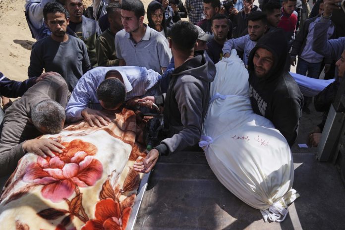 DEIR AL-BALAH, Gaza Strip (AP) — An Israeli airstrike flattened a three-story home in Gaza City on Saturday, killing 10 people — half of them children — as Arab mediators scrambled to restart a ceasefire.