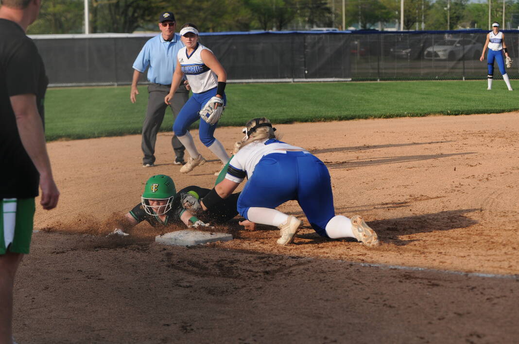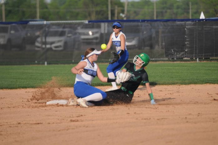 Columbus North shotstop Payton Morris and Floyd Central’s Addy Ware collide at second base as North second baseman Morgan Jarvis look on Wednesday at Southside Elementary in Columbus.