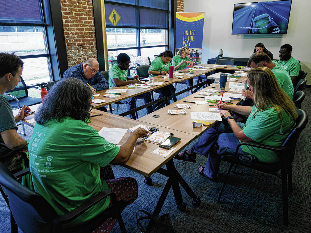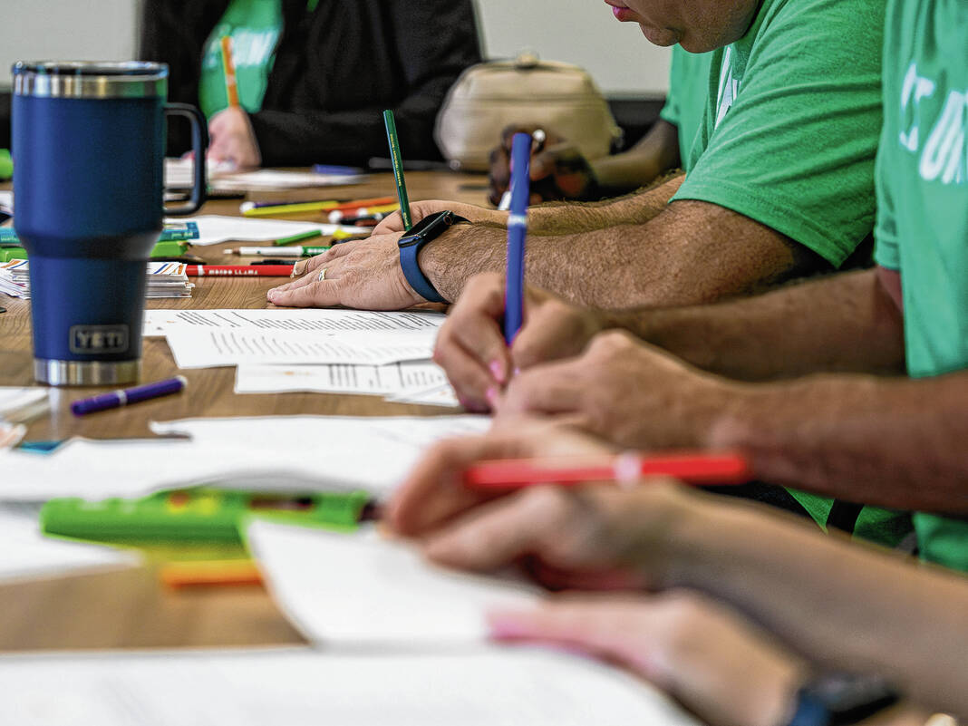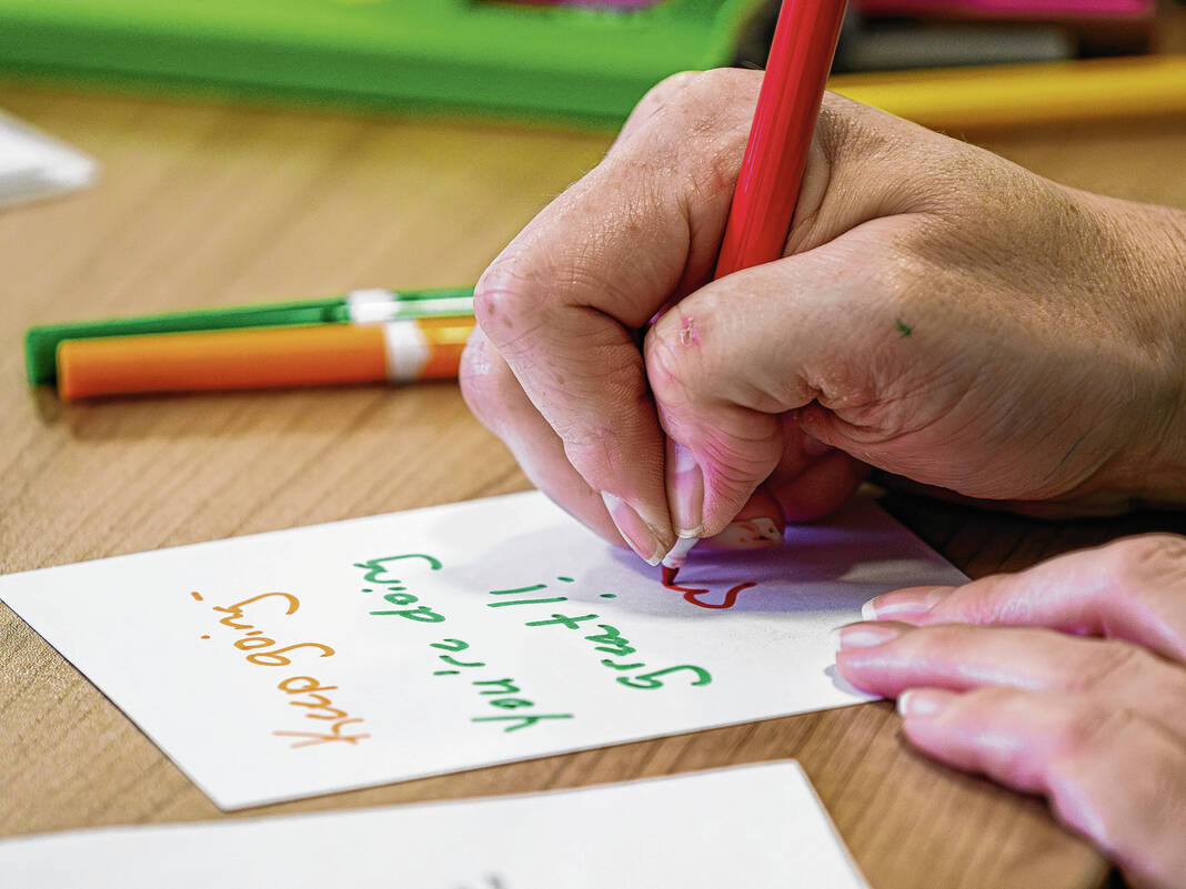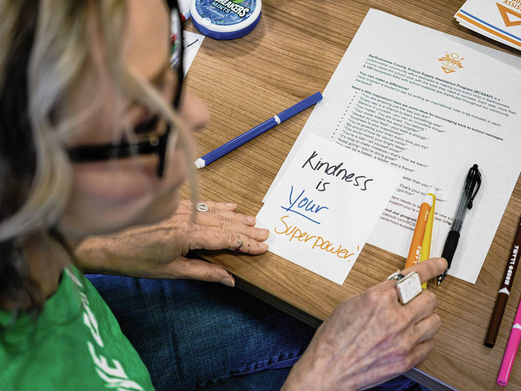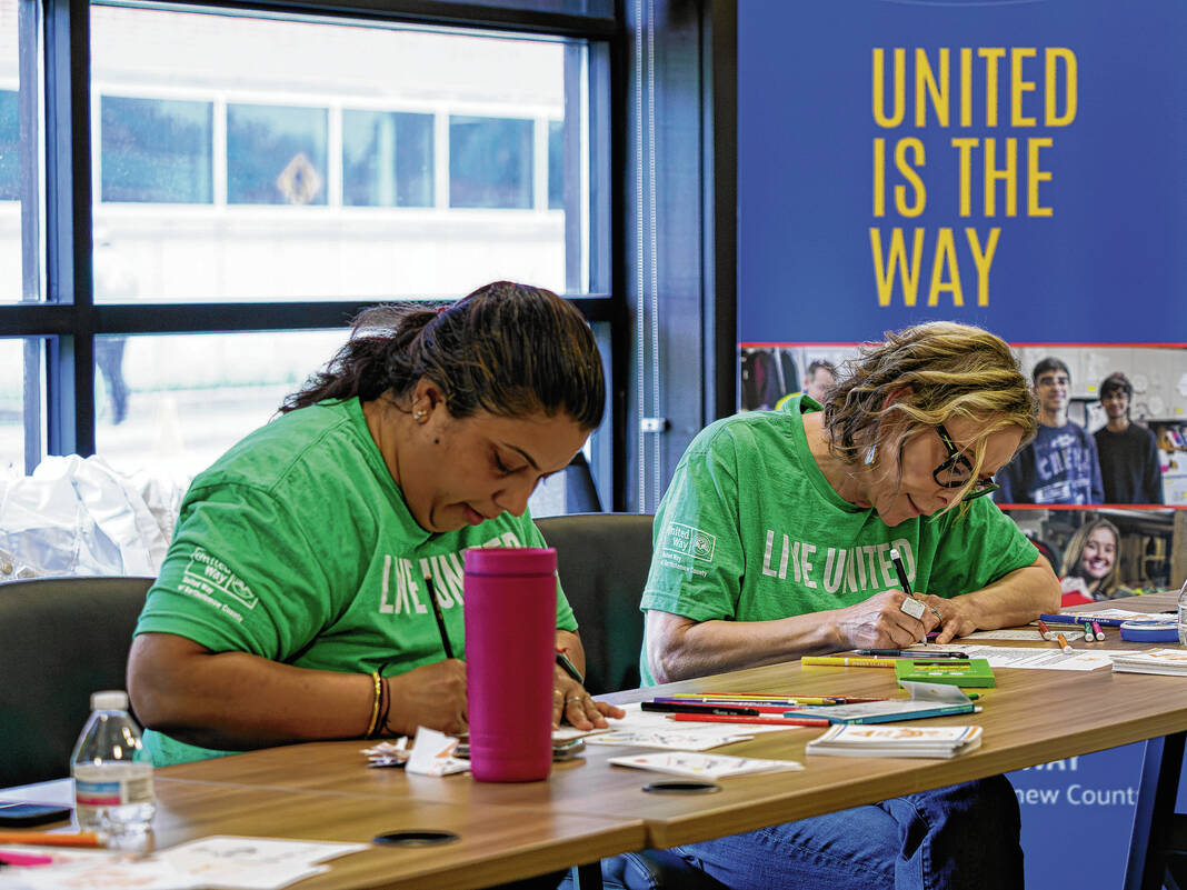 Mike Wolanin | The Republic Volunteers Ruchika Chander, left, Shelia Strickland write notes to inspire students that receive assistance from the School Supply Assistance Program during the United Way Day of Caring at the United Way building in Columbus, Ind., Friday, May 16, 2025.