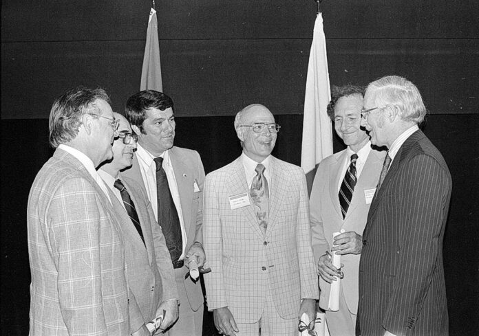 William Marshall, right, president of the American Institute of Architects, talks on May 19, 1975, with Columbus residents and architects who were honored at the AIA convention in Atlanta. From left are Richard Stoner of Cummins Engine Co., Ronaldo Giurgola, Columbus East High School architect; Robert Franke, president of the Bartholomew Consolidated School Corp. board; Robert N. Brown, publisher of The Republic; and Myron Goldsmith, principal architect of The Republic.