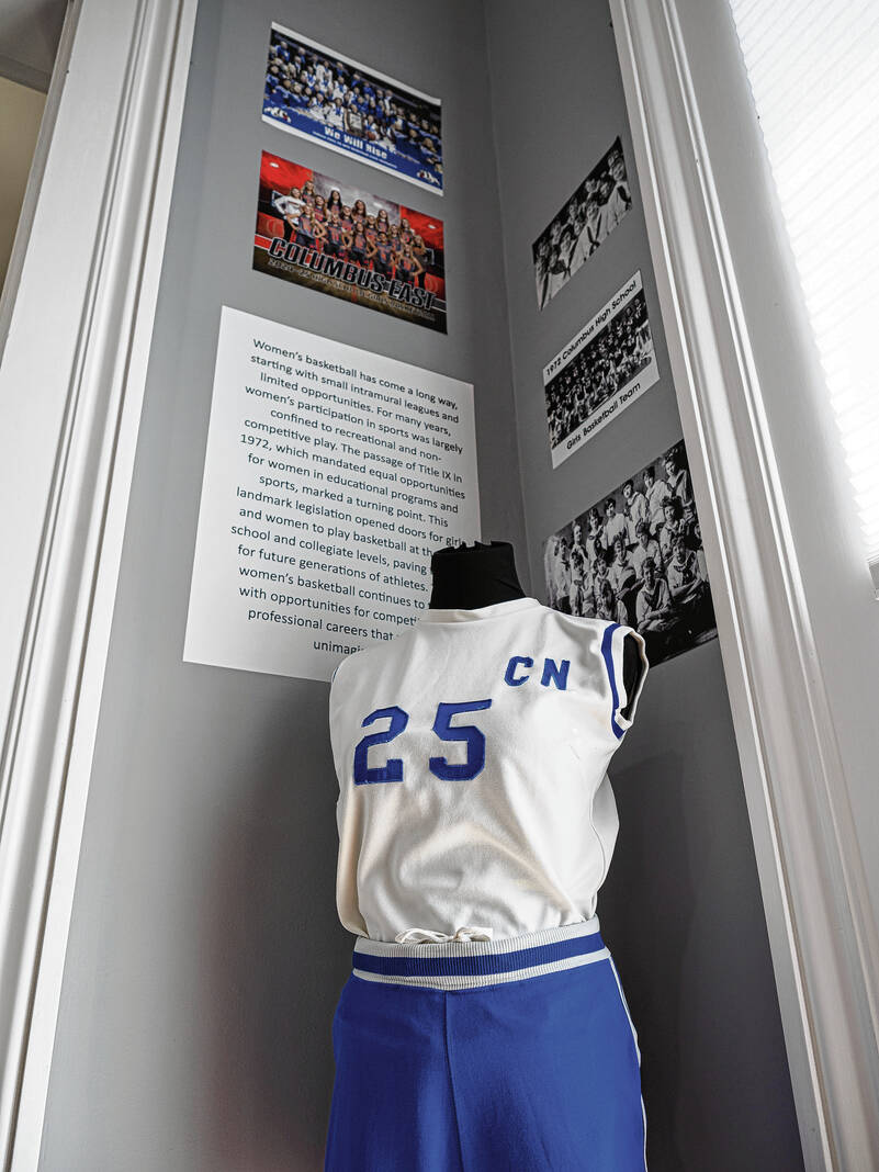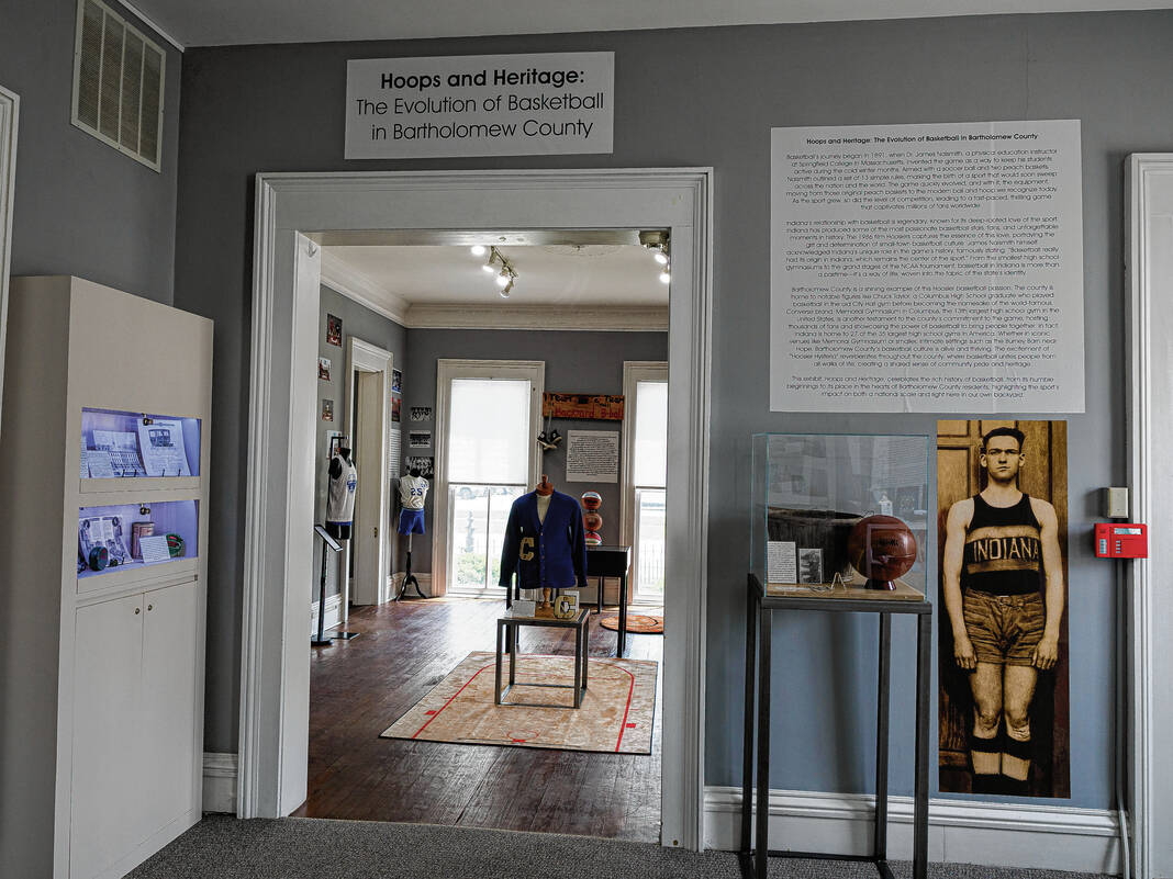 Mike Wolanin | The Republic A photo an unidentified basketball player is seen on the wall of the Hoops and Heritage: The Evolution of Basketball in Bartholomew County exhibit at the Bartholomew County Historical Society in Columbus, Ind., Wednesday, May 14, 2025.