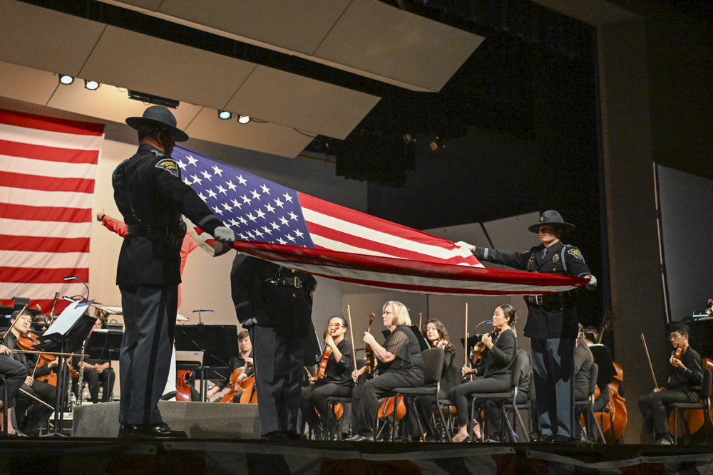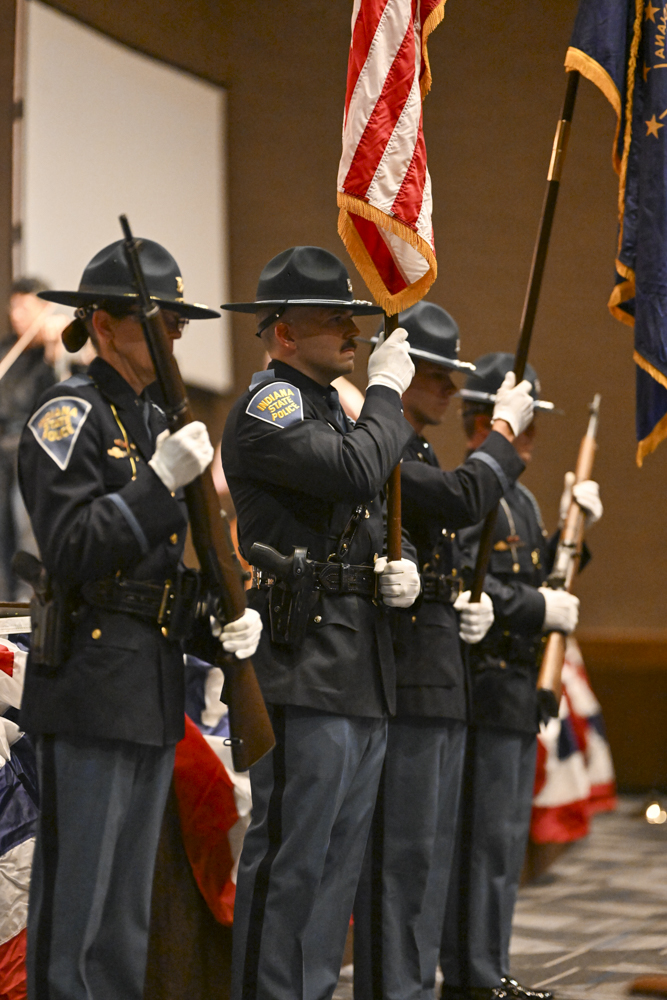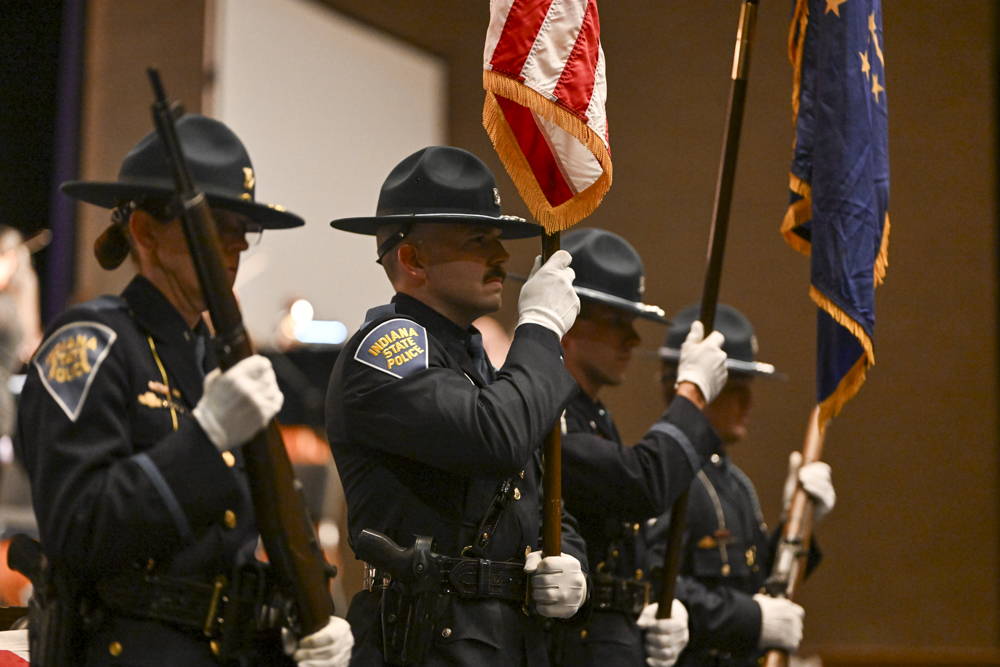 Indiana State Police Color Guard presents the colors for the opening ceremony of the Columbus Indiana Philharmonic during the annual Salute! concert at Columbus North High School on May 23 2025, in Columbus, Indiana.
