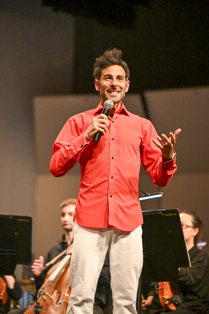 Music Director Isaac Selya speaks to the crowd during the Columbus Indiana Philharmonic's annual Salute! concert at Columbus North High School on May 23 2025, in Columbus, Indiana.
