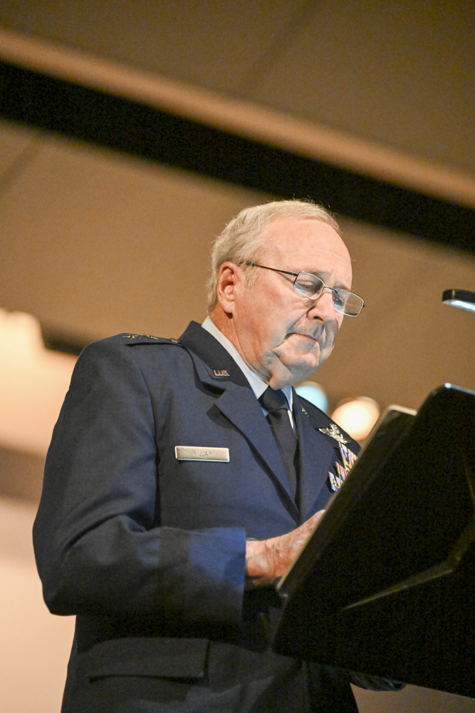 Retired US Air Force Maj. Gen. Mark Pillar reads letters from a fallen soldiers during WWII during the Columbus Indiana Philharmonic's annual Salute! concert at Columbus North High School on May 23 2025, in Columbus, Indiana.