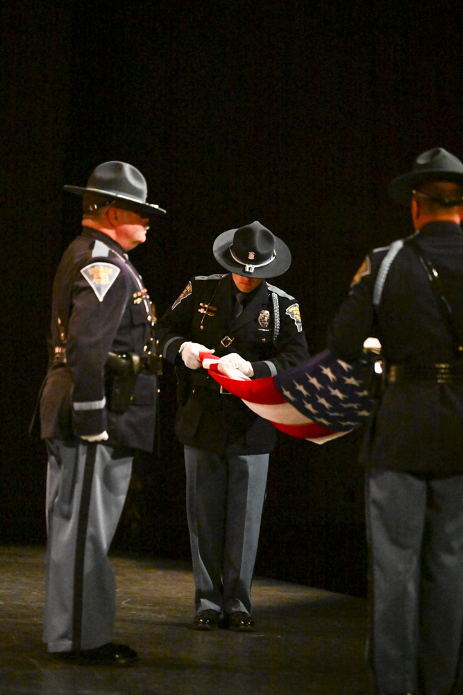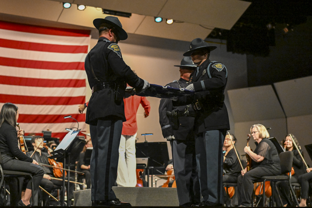 Members of the Indiana State Police Color Guard fold the American flag during the closing ceremony of the Columbus Indiana Philharmonic's annaul Salute! concert at Columbus North High School on May 23 2025, in Columbus, Indiana.