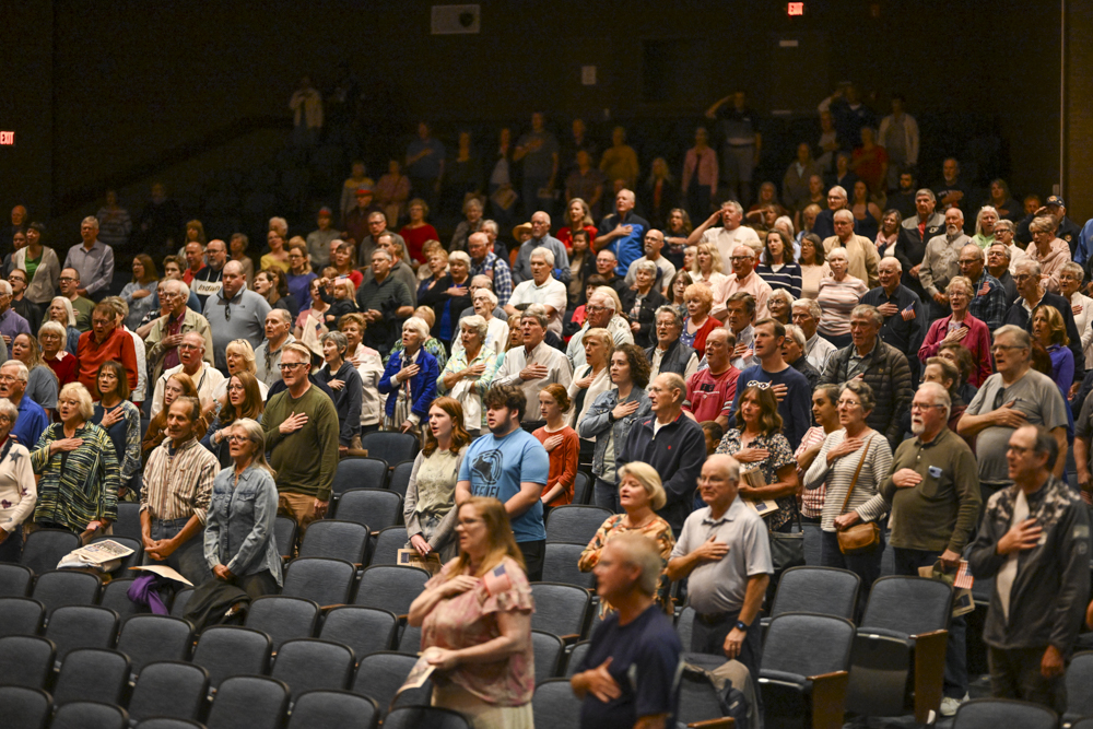 The crowd stands for the playing of the national anthem by the Columbus Indiana Philharmonic during the annual Salute! concert at Columbus North High School on May 23 2025, in Columbus, Indiana.
