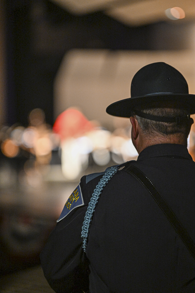 A member of the Indiana State Police Color Guard stands watch as the Columbus Indiana Philharmonic performs during the annual Salute! concert at Columbus North High School on May 23 2025, in Columbus, Indiana.