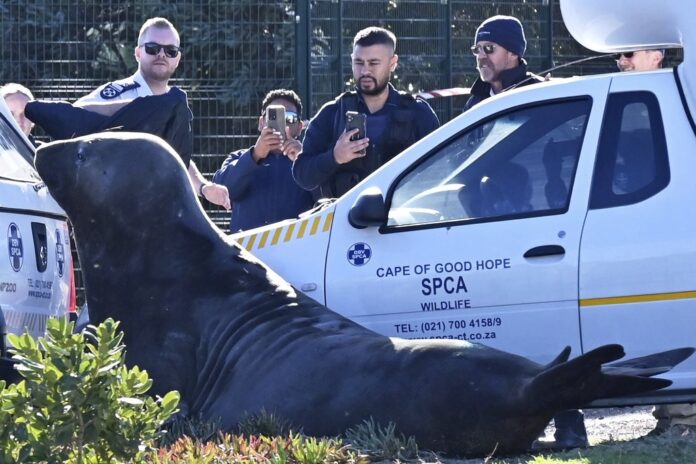 The two-ton seal, which an animal welfare group said was a young male, was making his way through a suburb of Gordon’s Bay near Cape Town.