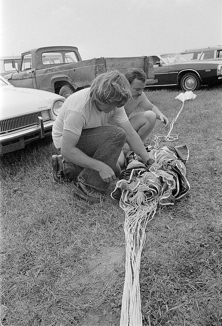 Ernie De Spain of Hartsville, in front, gets help from Larry Limley of Indianapolis in packing his parachute to jump again during a “scrambles” skydiving meet at the North Vernon airport on May 24, 1975.