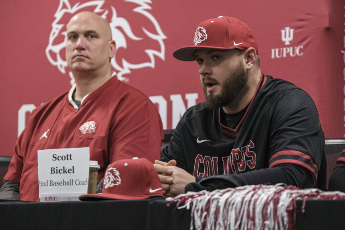 IU Columbus athletics director Zach McClellan, left, and former baseball coach Scott Bickel talk about the 2024 season during media day Jan. 11, 2024 at IU Columbus.