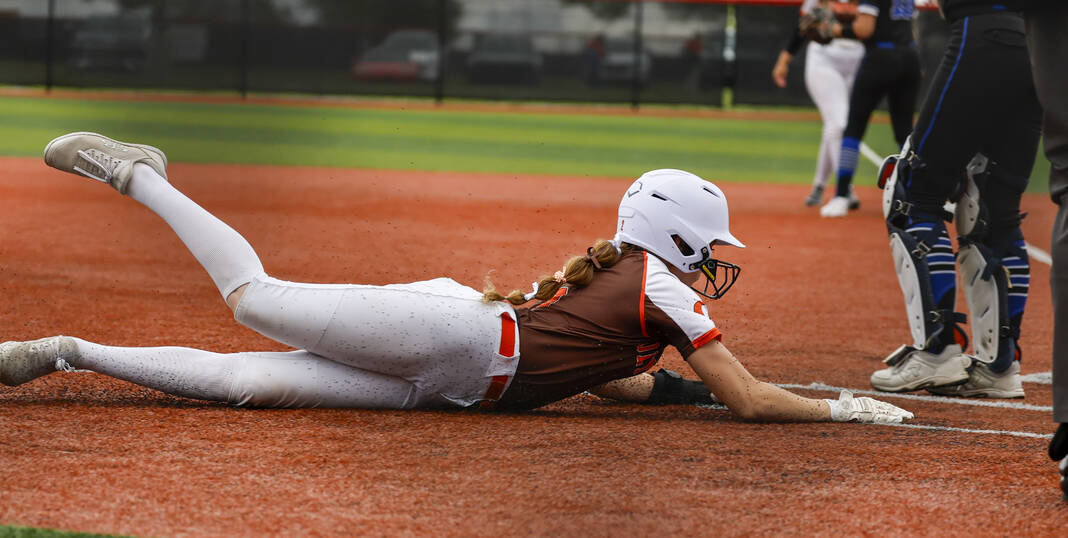 Columbus East’s Lola Watkins slides into home before Columbus North catcher Ali Wooten can apply the tag on a wild pitch in Wednesday’s East Central Sectional semifinal.