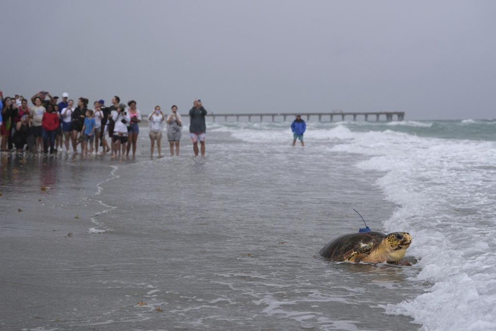 JUNO BEACH, Fla. (AP) — An adolescent loggerhead sea turtle named Dilly Dally crawled into the Atlantic Ocean Wednesday morning, months after having a front flipper amputated at a Florida turtle hospital.