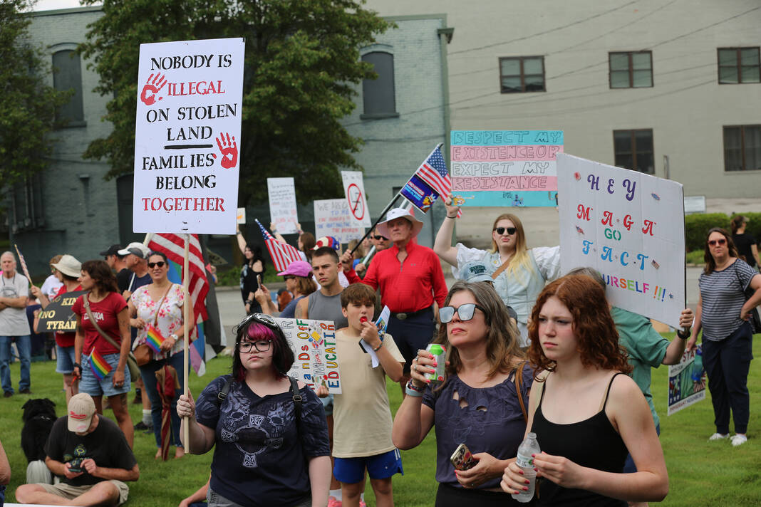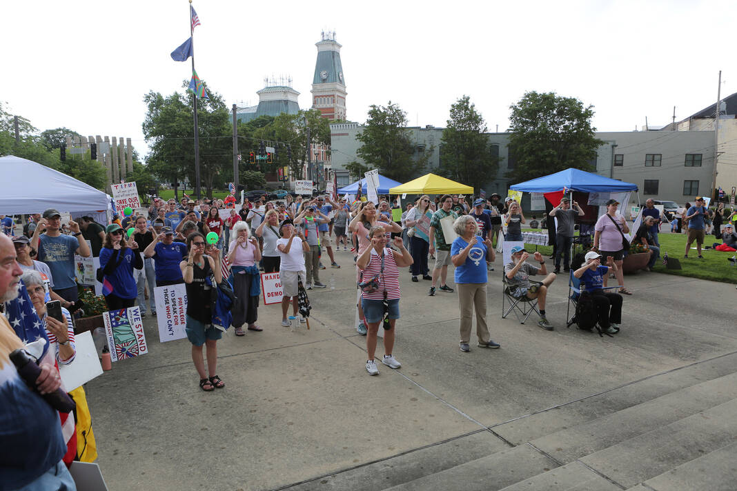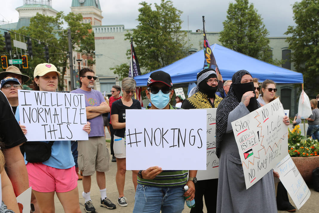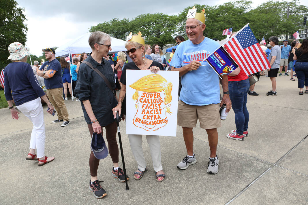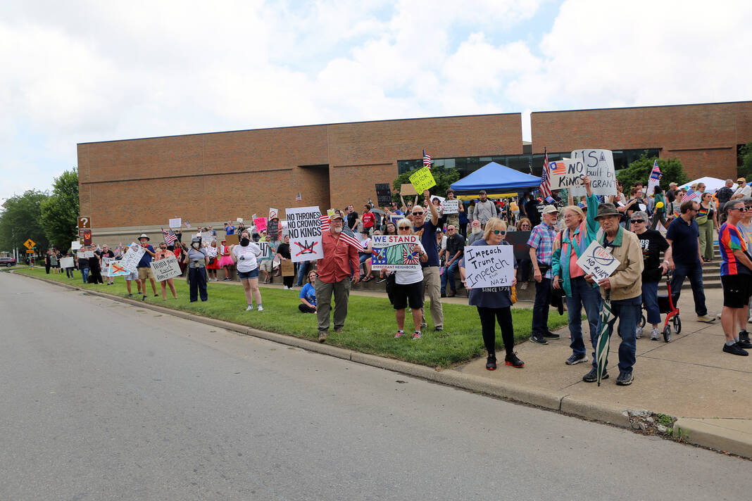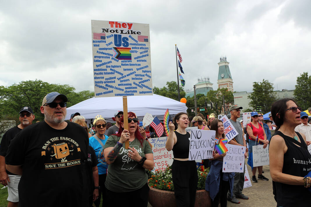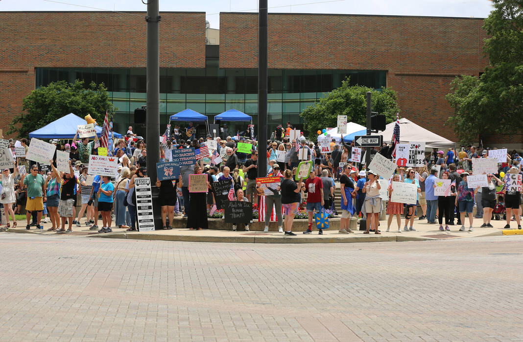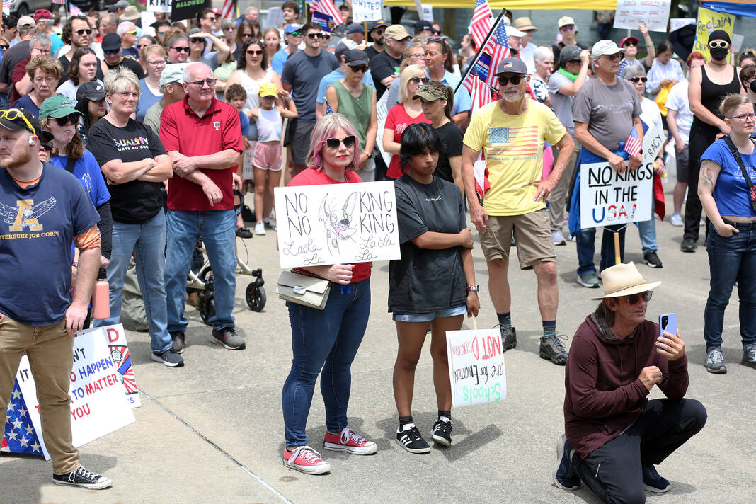 Carla Clark | For The Republic Protestors gather and listen to speakers during the No Kings Protest at Columbus City Hall held on the No Kings Nationwide Day of Defiance, Columbus, Ind., Saturday, June 14, 2025.