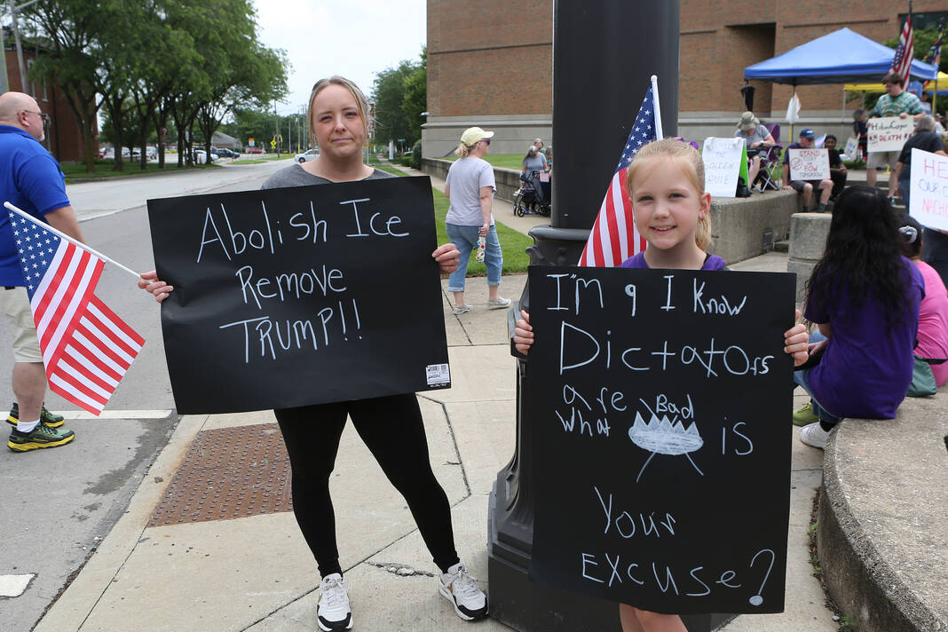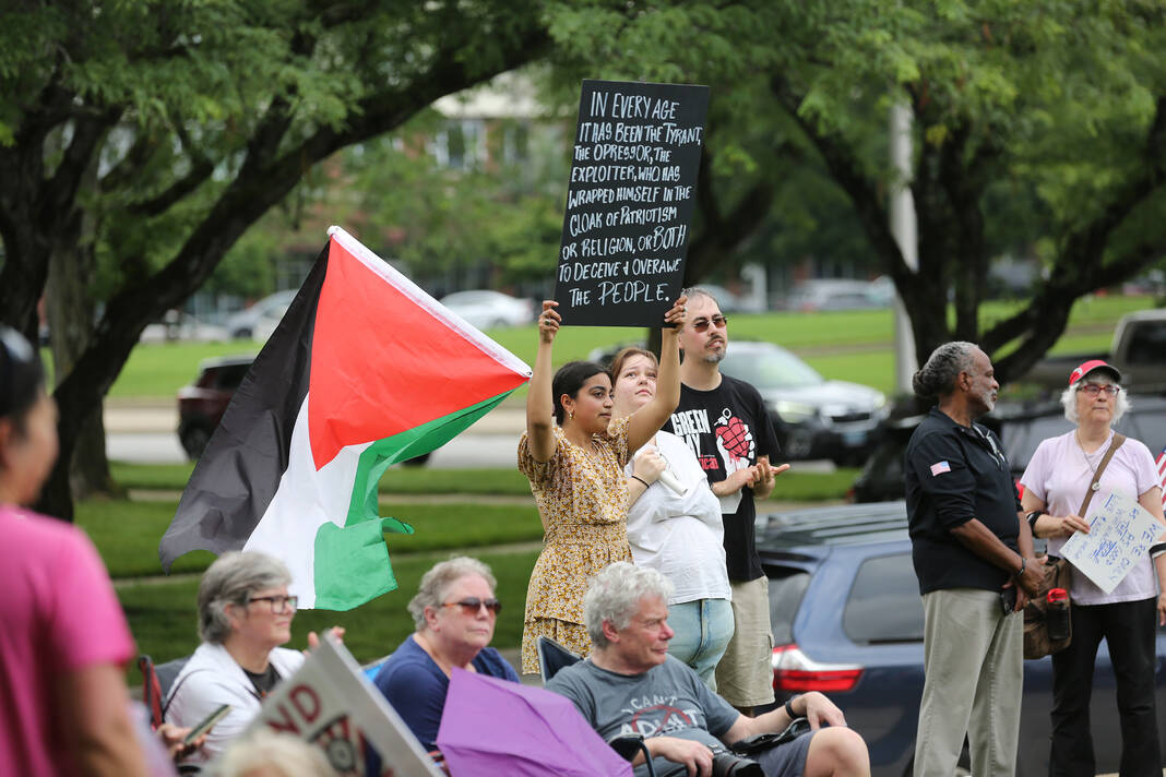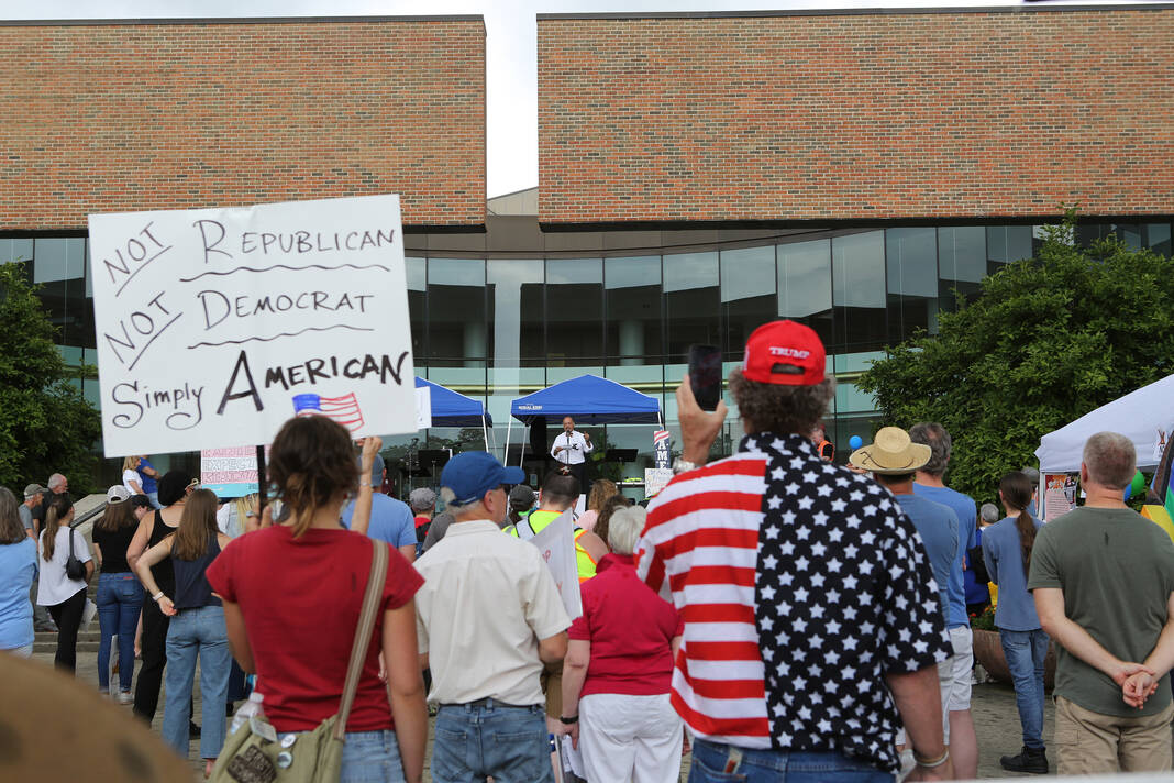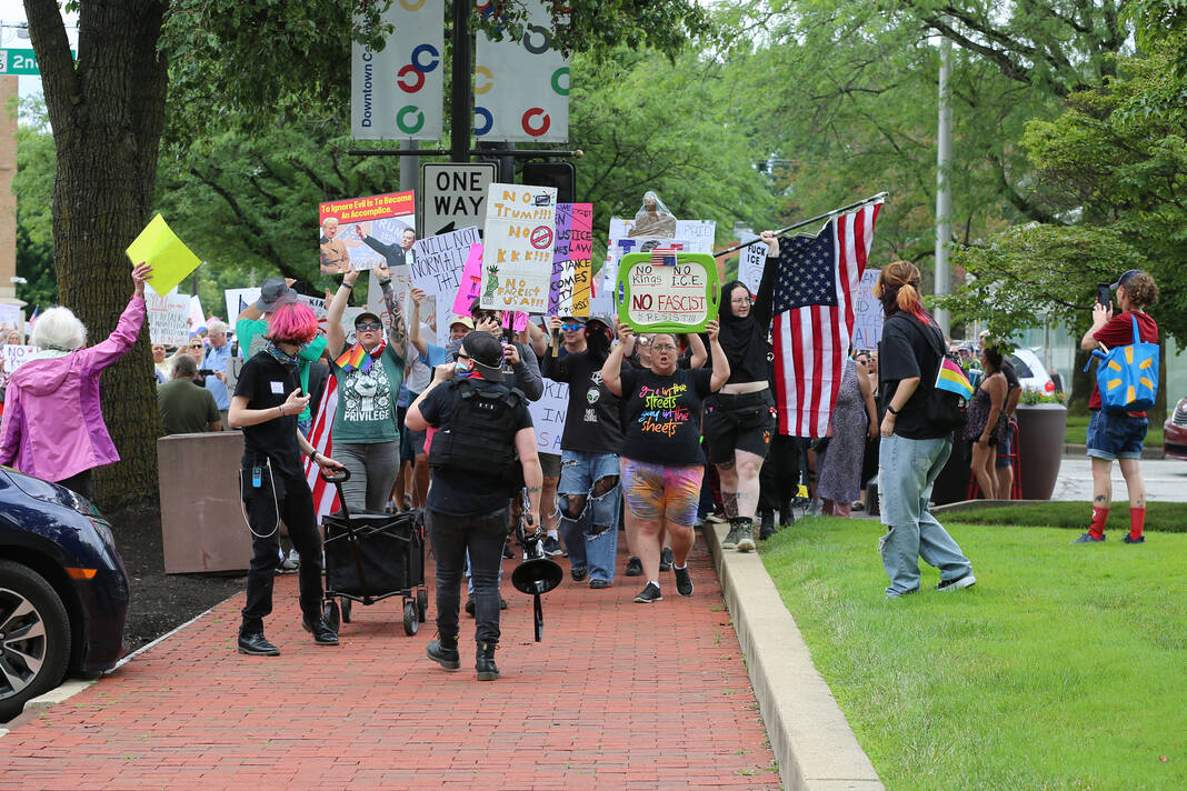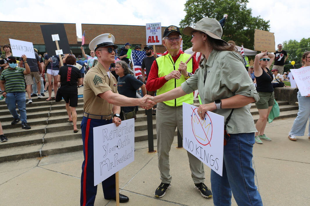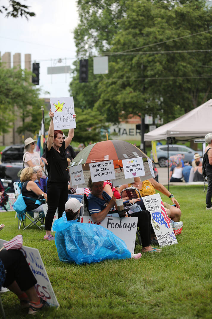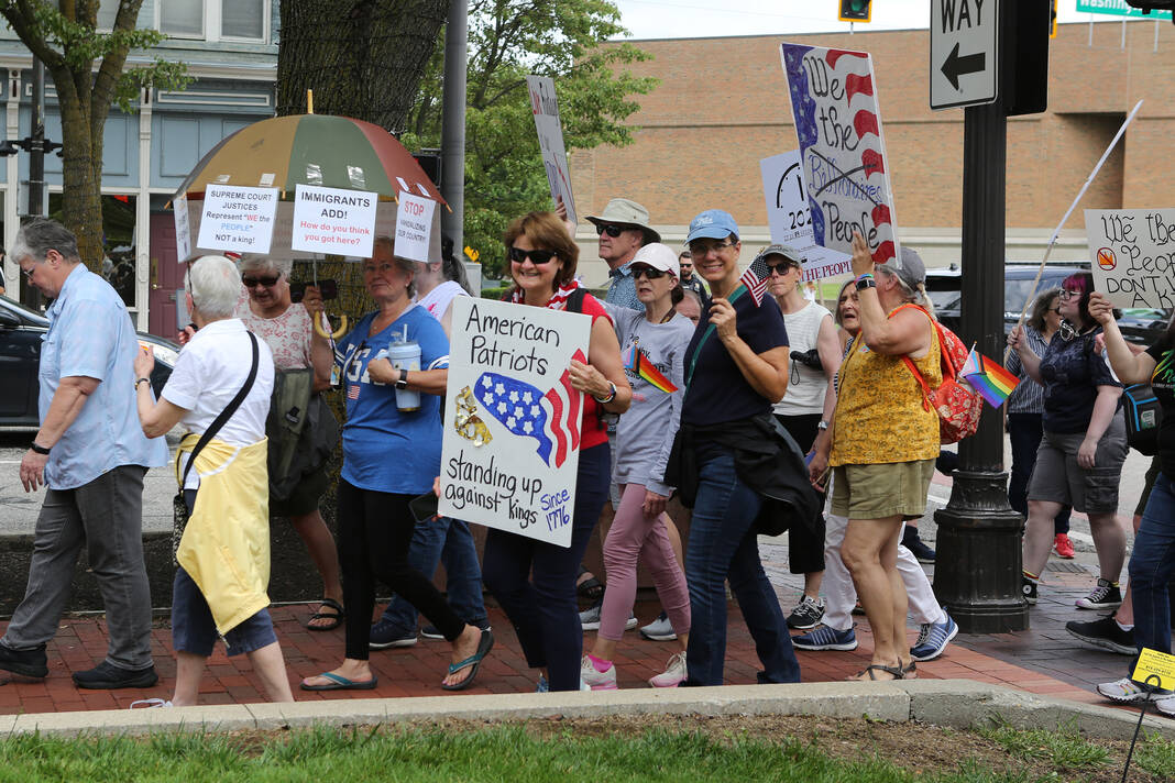 Carla Clark | For The Republic Protestors gather and listen to speakers during the No Kings Protest at Columbus City Hall held on the No Kings Nationwide Day of Defiance, Columbus, Ind., Saturday, June 14, 2025.