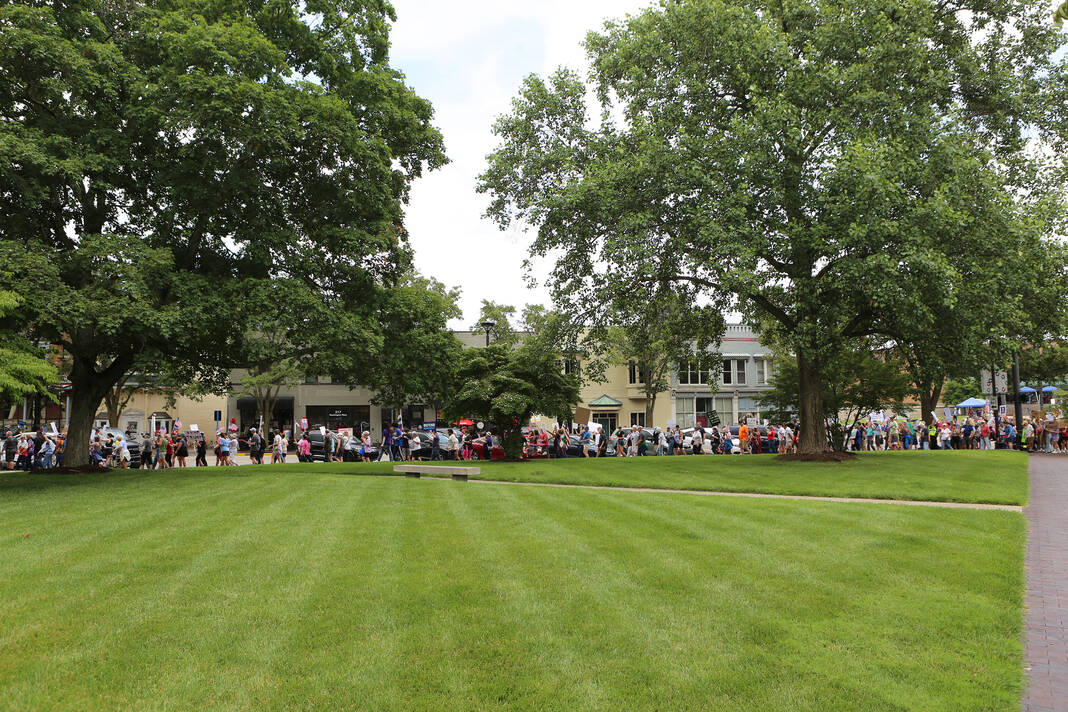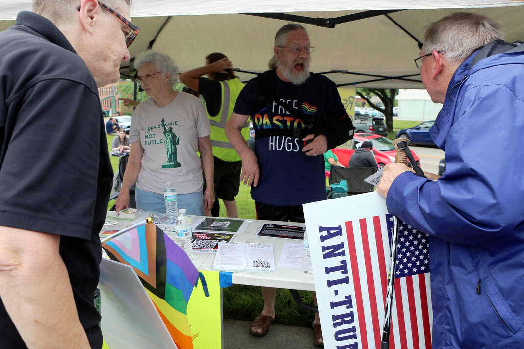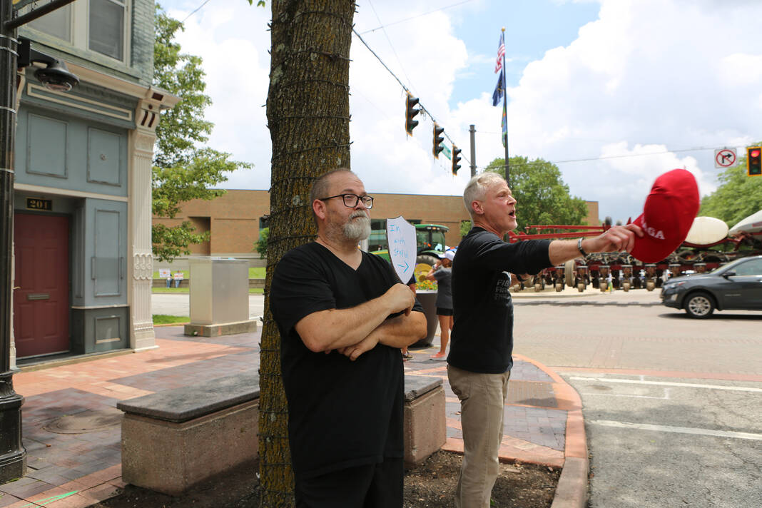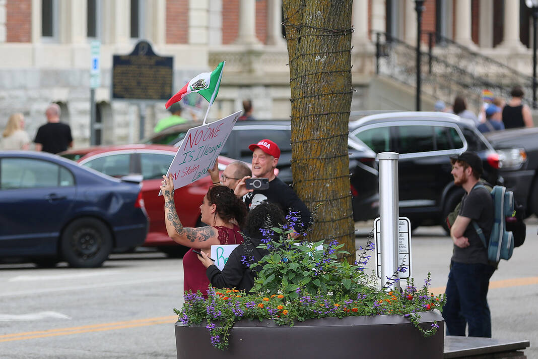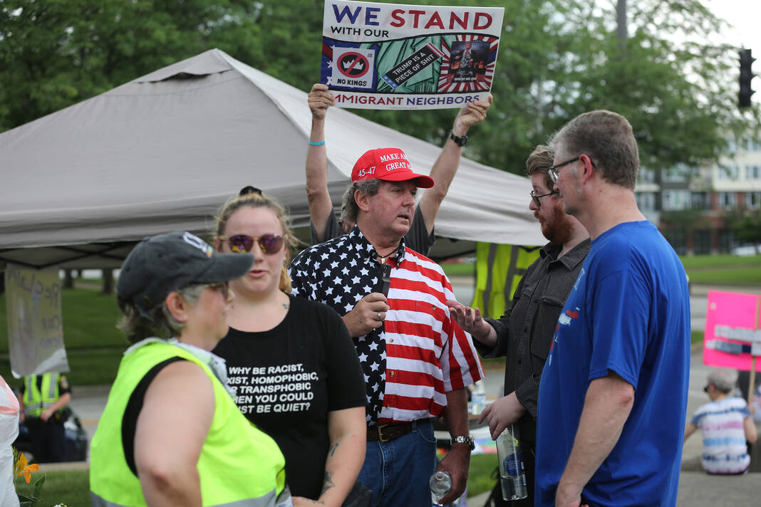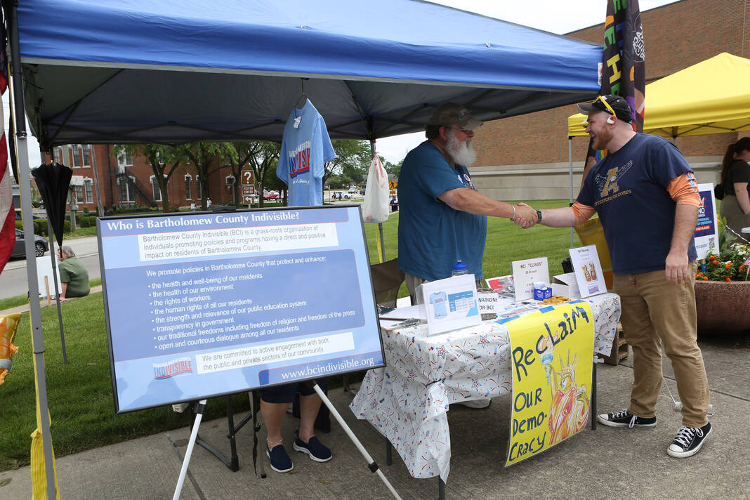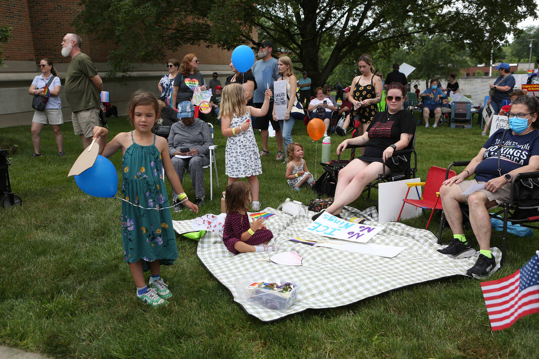 Carla Clark | For The Republic Protestors gather and listen to speakers during the No Kings Protest at Columbus City Hall held on the No Kings Nationwide Day of Defiance, Columbus, Ind., Saturday, June 14, 2025.