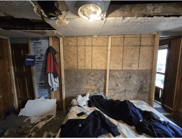 Photos inside the home show water-damage on counter tops and under the sink, an unstable kitchen floor, unsecured power outlets, a sagging roof and rotted soffits, along with various indications of structural issues.