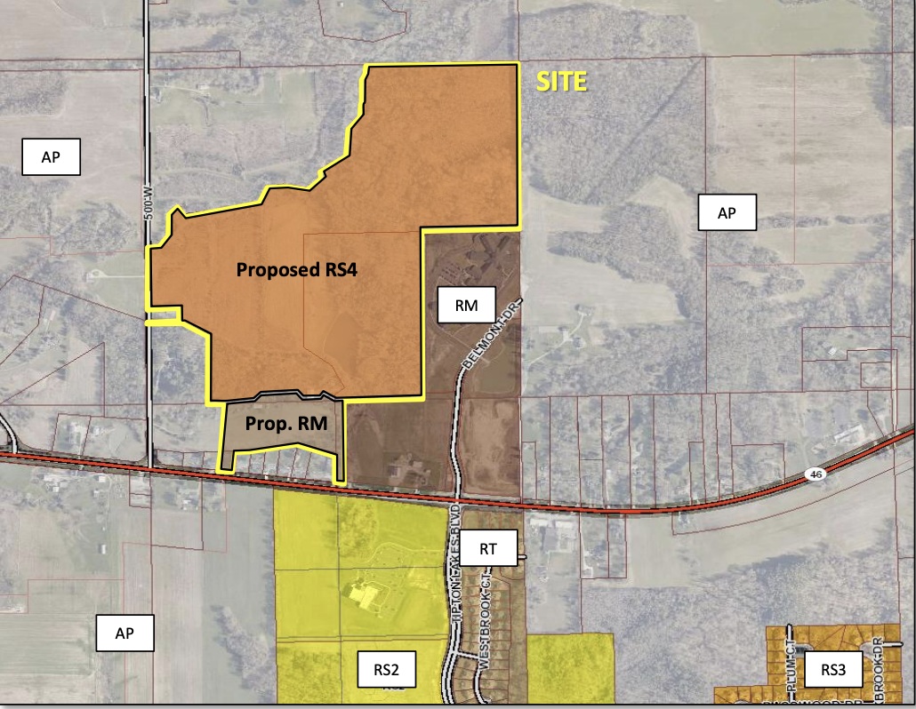 The annexation and rezoning area has frontage on Country Road 500W, State Road 46 and a future street right-of-way at Belmont Drive.