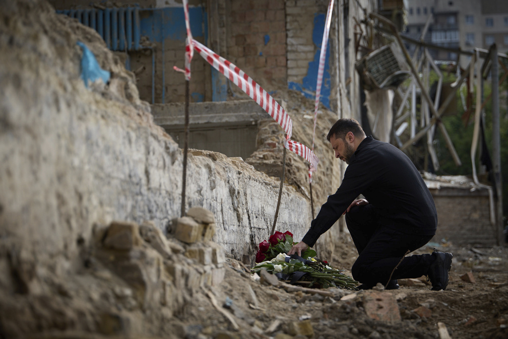 Zelenskyy, along with the head of the presidential office Andrii Yermak and Interior Minister Ihor Klymenko, visited the site of the apartment building in Kyiv’s Solomianskyi district Thursday morning, laying flowers and paying tribute to the 23 people who died there after a direct hit by a missile collapsed the structure.