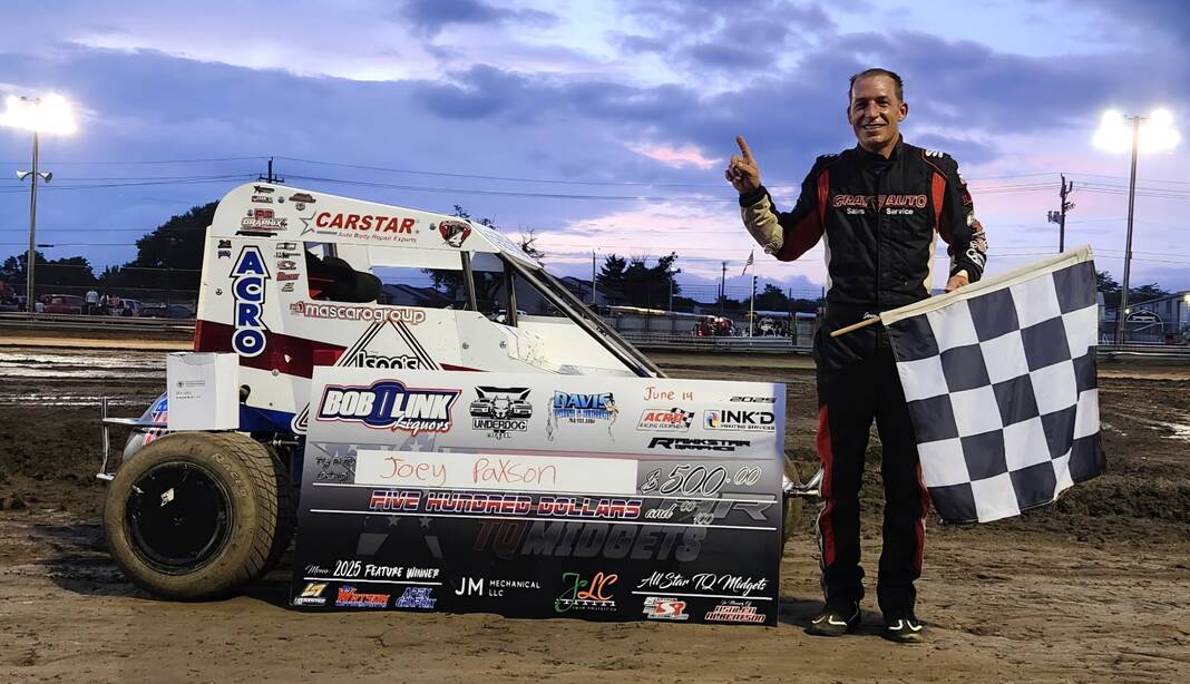 Joey Paxson drove the Tony Stewart Racing No. 1 All Star TQ Midget to the feature win June 14 at the Rush County 4-H Fairgrounds in Rushville. Tuesday night, the series will be in competition at the 2025 Bartholomew County 4-H fair race.