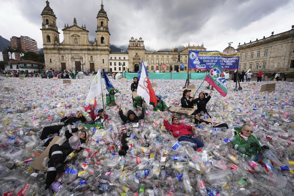 BOGOTA, Colombia (AP) — Dozens of Colombian waste pickers inundated Bogota’s iconic Bolivar Square with about 15 tons of recyclable goods Tuesday to protest decreasing income and tougher conditions for scavengers. They collect trash from homes, factories and office buildings and sell it to local recycling plants.