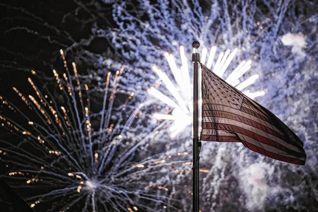 Mike Wolanin | The Republic A firework explodes behind the American flag during the QMIX Musical Fireworks celebration at the Ivy Tech campus in Columbus, Ind., Wednesday, July 3, 2024.