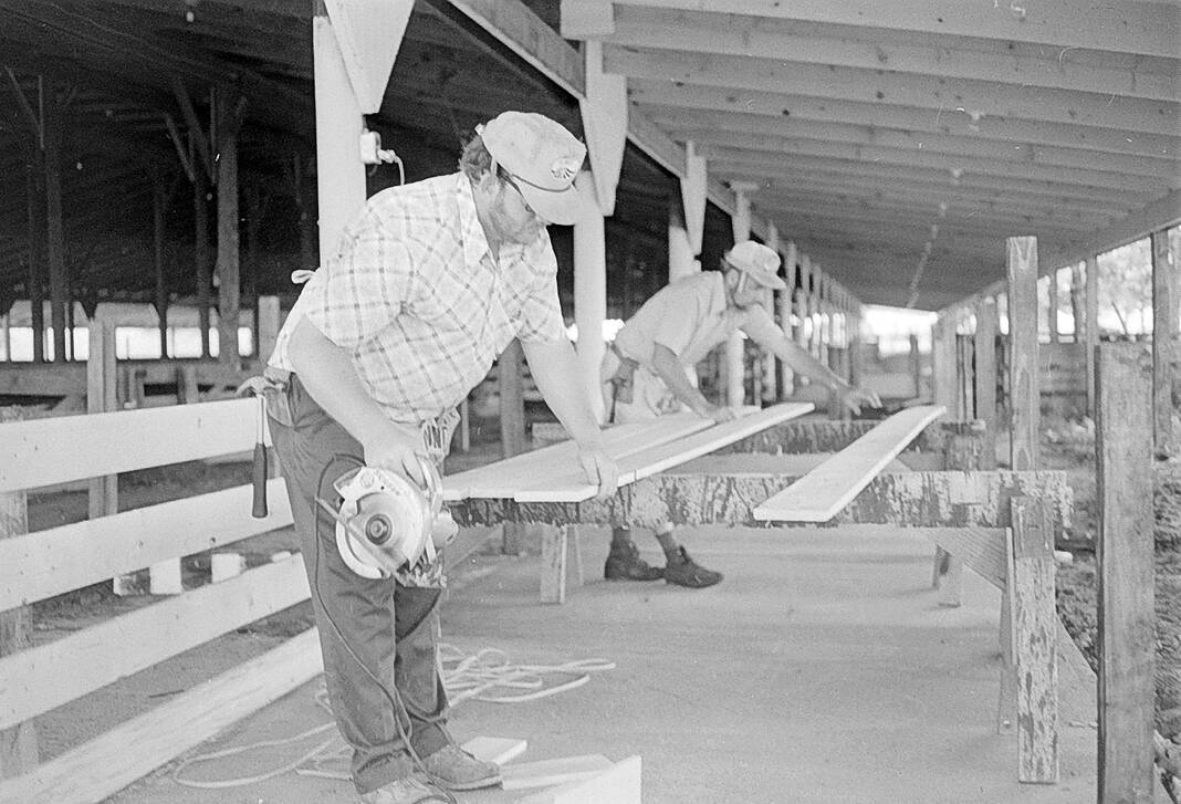 Tim Voorhies, foreground, math teacher at Southside Junior High School, and Larry Harden, fair board member and principal of Taylorsville Elementary School, work on the new westside section of the livestock barn at the Bartholomew County 4-H Fairgrounds on June 26, 1975.