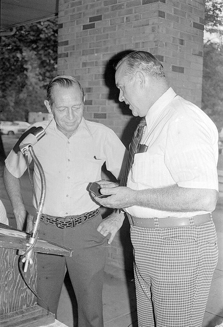 Columbus Fire Chief Maurice Jordan presents retired city fireman Edgar Harris, left, with a medallion for Harris’ service with the department on June 27, 1975.