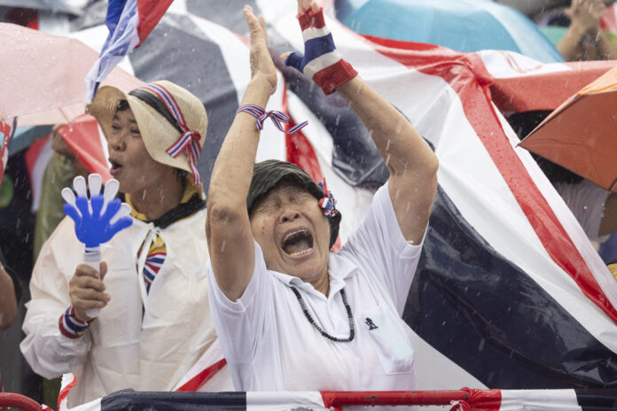 About 20,000 protesters joined the rally as of Saturday night, according to an estimate by the Bangkok police. Despite a downpour in the afternoon, they held national flags and placards around the Victory Monument in central Bangkok as speakers took turns blasting the government. The participants, many of whom came in the morning, chanted slogans, sang and danced to nationalist songs.