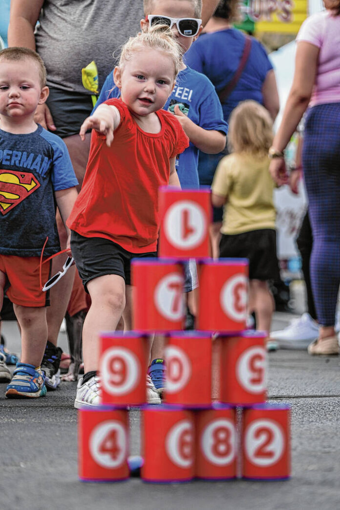 Mike Wolanin | The Republic Kiara Miller attempts to knock some cans over during the QMIX Musical Fireworks celebration at the Ivy Tech campus in Columbus, Ind., Wednesday, July 3, 2024.