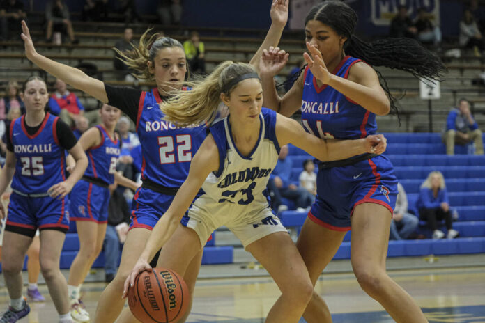 Columbus North’s Miley McClellan, center, shields the ball from Roncalli’s Brennah Cerny, left, and Jasmine Horsman Jan. 25, 2024, at Columbus North.