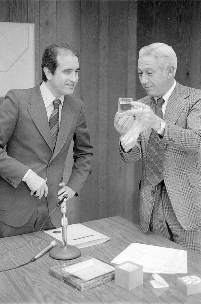 Mayor Giovanni Picco of Turin, Italy, talks with Mayor Max Andress during a press conference on July 3, 1975, at Columbus City Hall, at which Picco was presented with an honorary citizen certificate. Picco was visiting in Columbus as part of a U.S. State Department-sponsored tour.