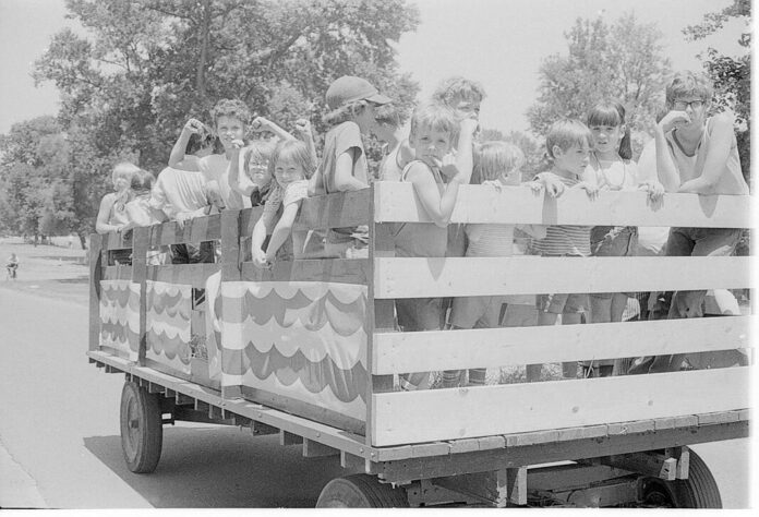 Children young and old alike enjoyed the old-fashioned hayrides on July 4, 1975, at Mill Race Park. The hayrides were part of the Fourth of July celebration held at the park.