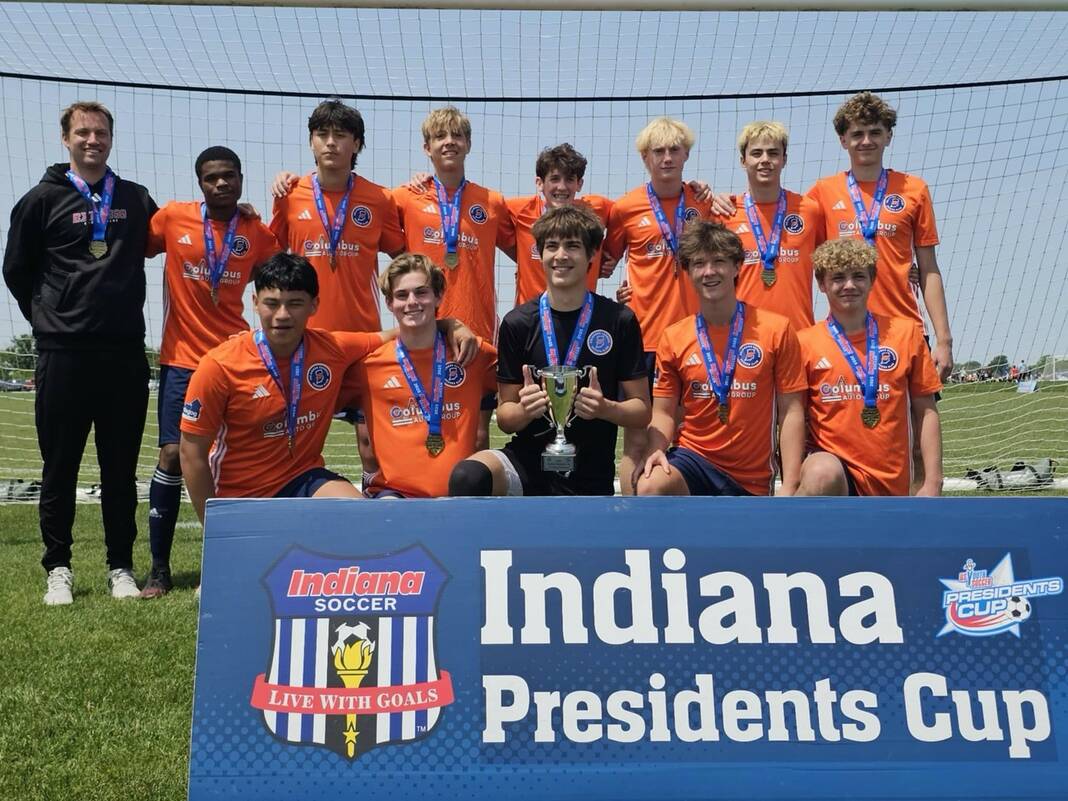 The 2008 Columbus Express Orange team won the Indiana Presidents Cup title in May. Team members include, front row from left, Axel Cardoso, Eli Ostrom, Ryder Meek, Gavin Fugate, Nick Mann; and back row, coach Ty Smith, Marckenson Paul, Emilio Quintero, Luke Moore, Arno Risner, Lane Woodard, Eduardo Aranda-Michel and Brody Johnson.