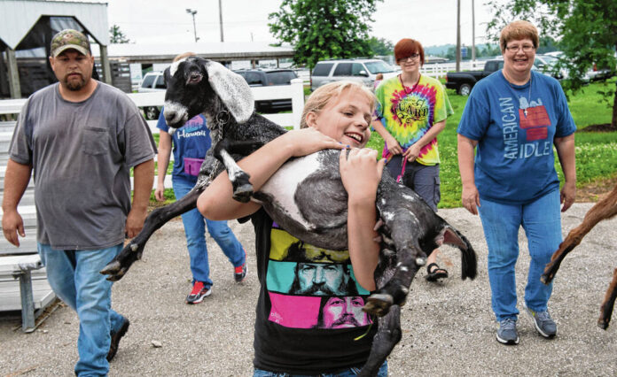 Paige Ramsey carries a goat to the livestock barn on July 10, 2015, at the Bartholomew County 4-H Fair.