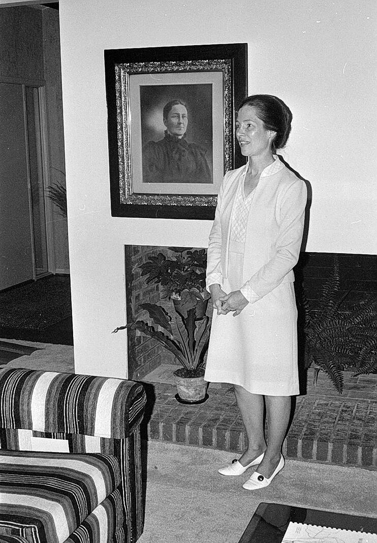 Ann Hackett greets Contemporary Home Tour visitors on July 13, 1975, in the living room of the family home in Forest Park.