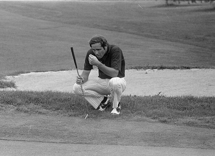 Former Columbus golfer Brent Loeloff lines up his putt on the 14th green during the second round of the Indiana Amateur Gold Tournament on July 15, 1975, at Otter Creek. Loeloff had a 78 after a first-round 71 to easily make the cut for the final two rounds.