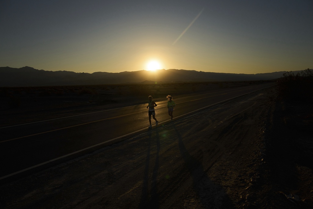 The runners dash toward mile 50.8 (81.75 kilometers), the critical cut off point they must get to by 10 a.m. or be eliminated. The sun is peaking over the mountains, casting a warm glow over dune fields. It’s 85 F (29.44 C).