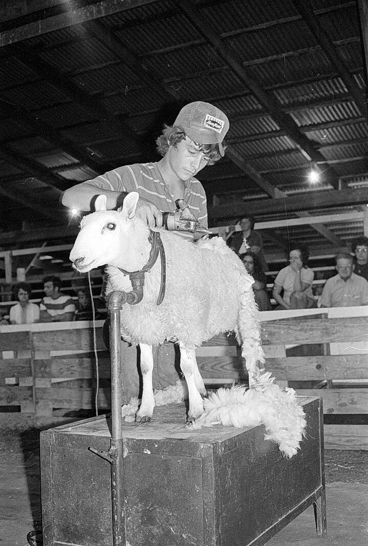 Rick Wolfe won the senior division in the sheep shearing contest on July 21, 1975, at the Bartholomew County 4-H Fair.