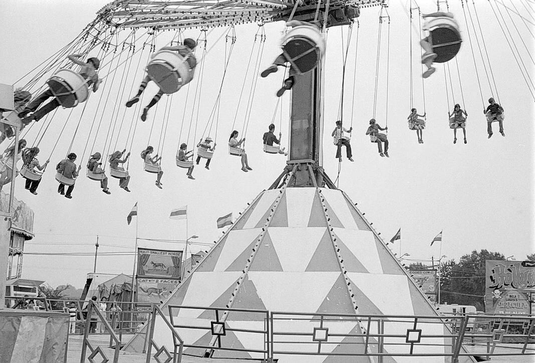Bartholomew County 4-H Fair visitors swing high above the midway on the Satellite Flight, a flying swing ride from Holland, on July 24, 1975.