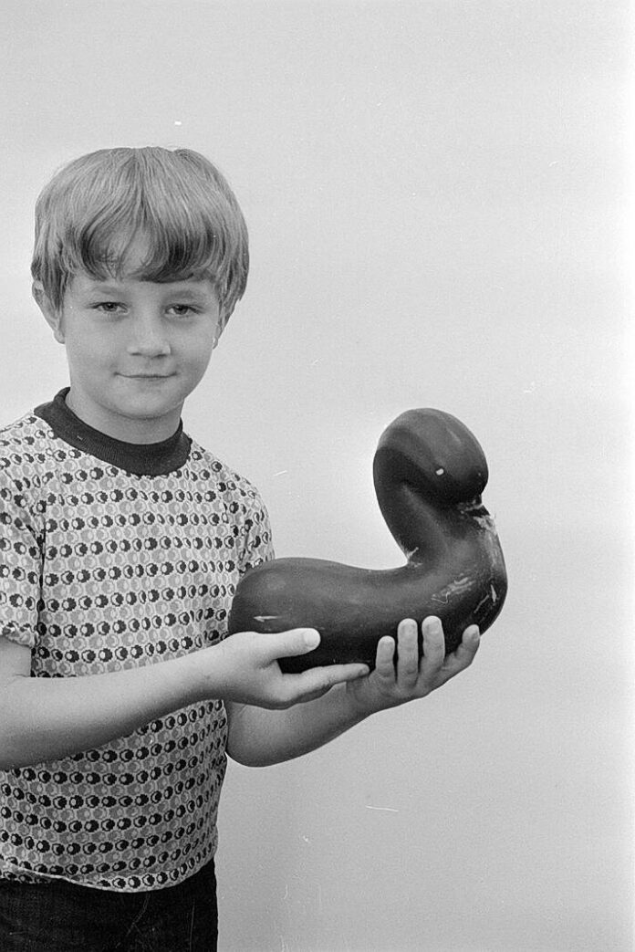 Brian Elikins, 5, holds a zucchini he found in his parents’ garden, which is shaped exactly like the body of a swan, on July 29, 1975.