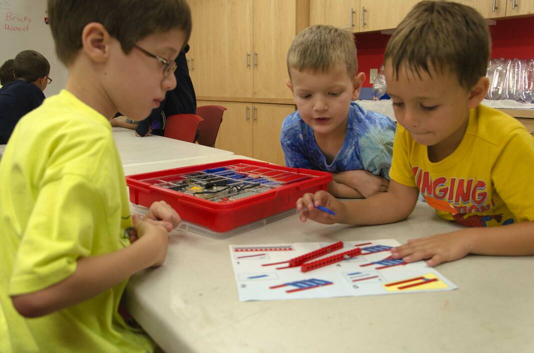 From left, Cameron Blue, Bobby Witt and Corin Fisher follow the steps given to them to build a Lego lawn chair on July 27, 2015, during kidscommon’s Lego camp.
