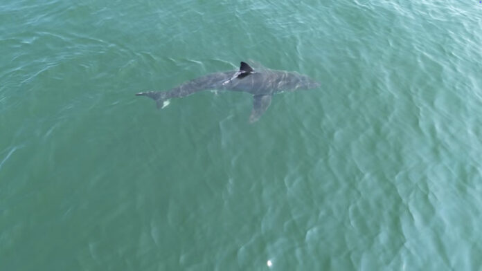 Commercial clam fisherman David Lancaster was able to take drone footage of the shark swimming just beneath the surface, its grey fin poking through the gentle swells. He said seeing the big shark was “magnificent,” if a little surprising.