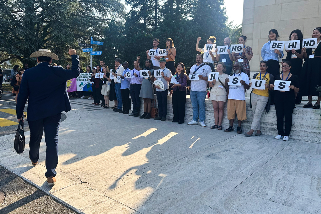 GENEVA (AP) — Environmentalists and Indigenous leaders held signs Tuesday in front of the United Nations buildings in Geneva, where talks for a global accord to end plastic pollution are taking place, asking nations to show courage and agree to a strong treaty.