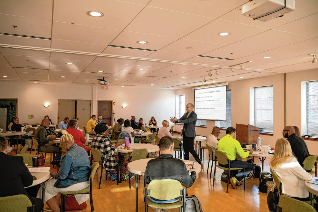 Greg Fisher, the Larry and Barbara Sharpf Professor of Entrepreneurship at IU Kelley School of Business, center, teaches business strategy, one of four short courses taught by Kelley faculty through Enterprise Corps.